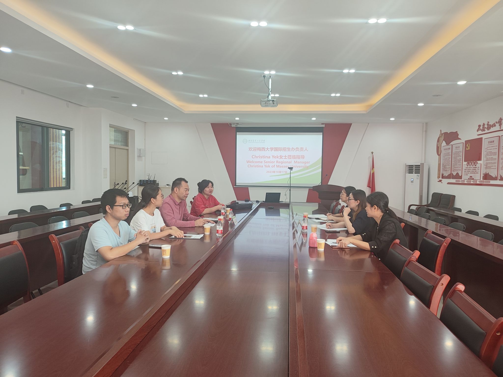 10月17日上午,新西兰梅西大学国际招生办负责人Christina Onn Ling Yek来校交流,交流会在白云校区生命科学楼607会议室举行。对外交流合作部副部长赖菊、公司党总支书记昌灯圣、副经理刘敏姬、国际教育科科长吴慧姗以及国际班部分员工参加会议。会议由昌灯圣主持。